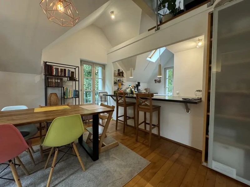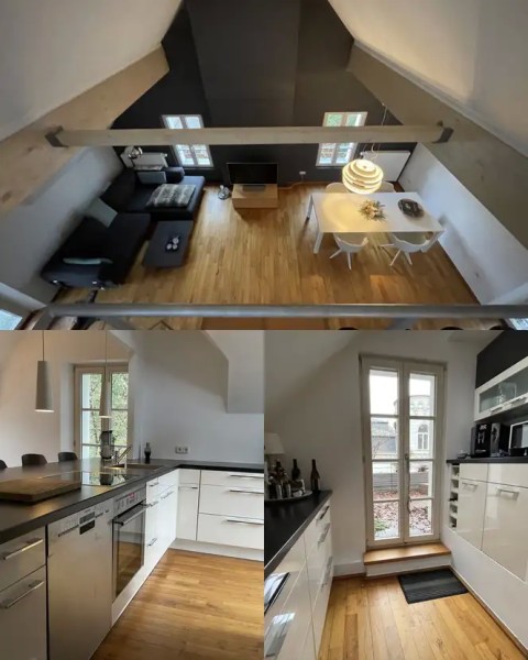 Die recht moderne Wohnung erstreckt sich hauptsächlich über die oberen zwei Etagen des Gebäudes, wobei sich der Wohnungseingang im Erdgeschoss befindet.