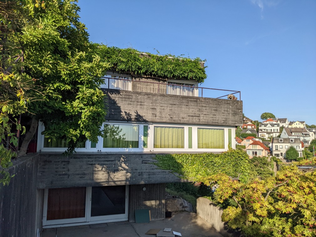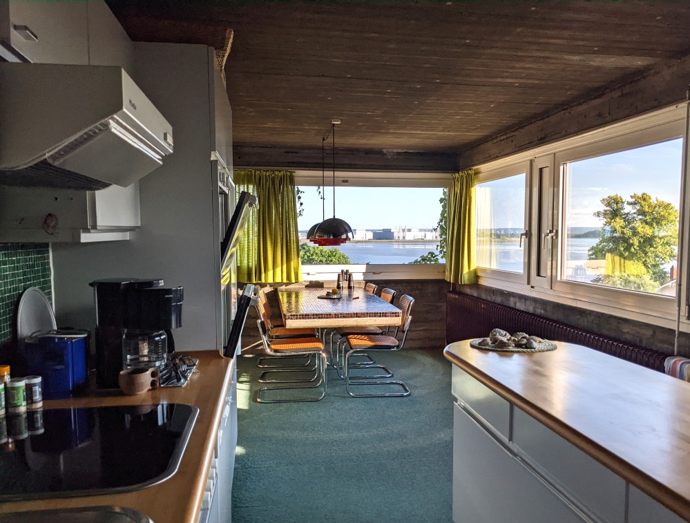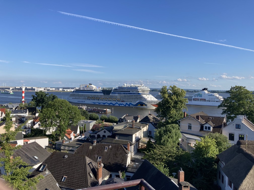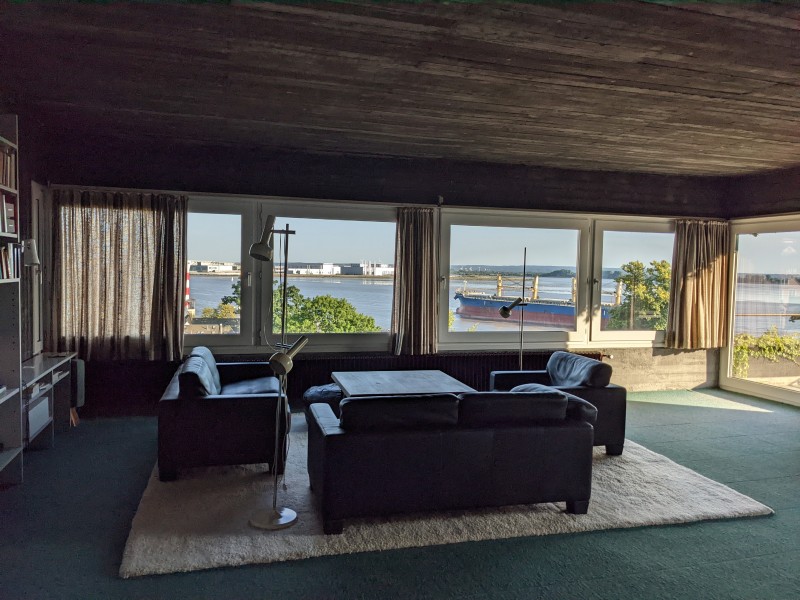 Das Haus besticht durch einen phantastischen Blick auf das gesamte Elbpanorama. Von der 30 m² großen Terrasse oder durch die großen Panoramafenster des Hauses ziehen die Giganten der Meere (Containerschiffe, Tanker und Kreuzfahrtschiffe) auf Augenhöhe vorbei.