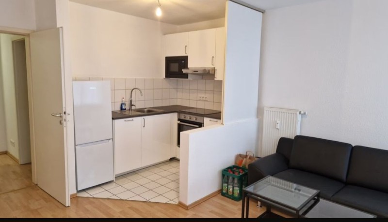- großzügiges Wohnzimmer mit offenem Küchenbereich und neu eingebrachter Einbauküche, Wohnzimmer wird mit einem Sofa mit Schlaffunktion ausgestattet