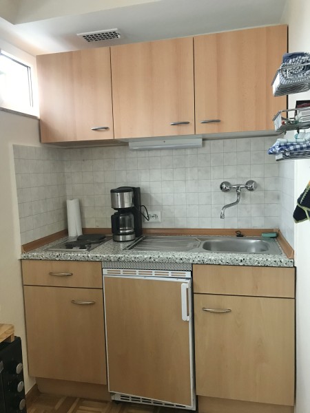 vollmöbliert mit W-Lan, TV, DVD, Designer-Ledersofa (2 m), Bett (200 x 100 cm), Schrankwand, Kleiderschrank, Arbeitstisch, Kitchenette (voll ausgestattet mit Kochfeld, 4* Kühlschrank, Minibackofen, Mikrowelle, div. Geschirr)