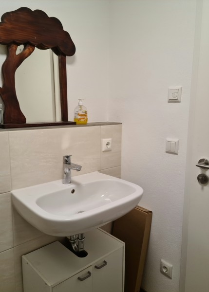 Dazu eine neue kleine Küche mit Mikrowellen Kombi-mit Grill -Heißluft und Kühlschrank. Weiter steht sowie ein Bad mit Dusche und WC zur Verfügung.