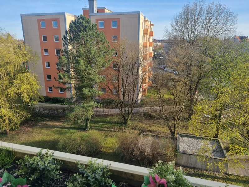 Helle, ruhige, großzügige 1-Zimmerwohnung im Alt Moosach mit Blick auf viel Grün, 4. Etage, Süd-West Loggie, Parkett, renoviert, frei ab 15.02.2024, teilmöbliert, Wohnfläche 45 qm, Aufzug,