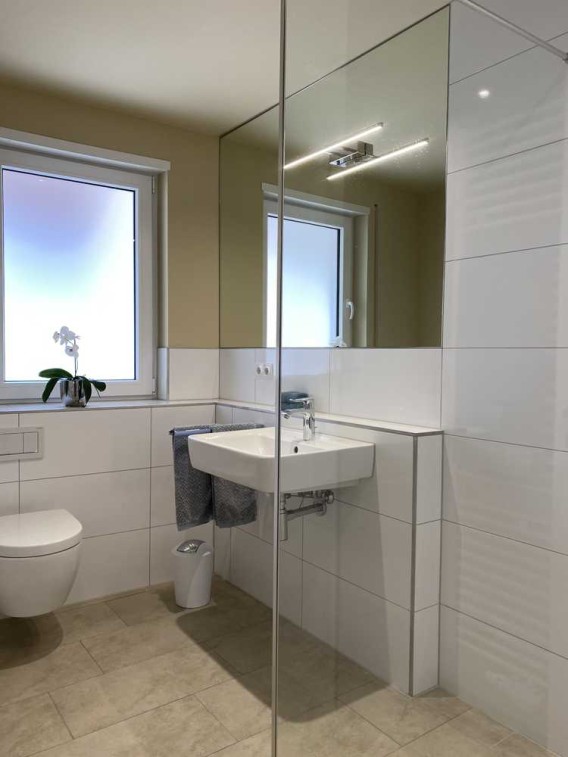 Das freundliche Tageslicht Badezimmer mit Walk-In-Dusche ist mit Keramik von Duravit, Armaturen von Hans Grohe, Accessoires von Keuco, eine Handtuchwärmer sowie einer großen Spiegelfläche ausgestattet, die diesen hellen Raum noch geräumiger wirken lässt.