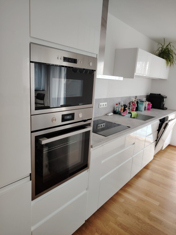 Die Einbauküche müsste abgelöst werden, da sie vor 4,5 Jahren neu in die Wohnung gebaut wurde und perfekt in das Zimmer passt.