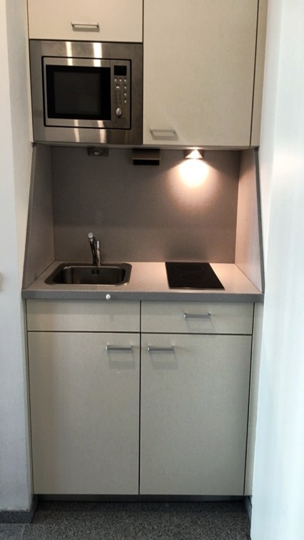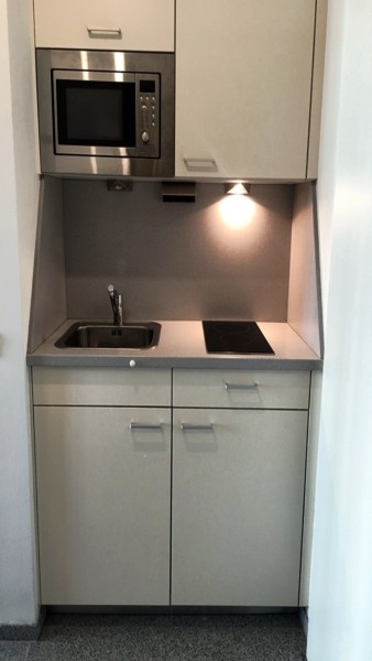 - eingebaute Pantry-Küche mit Ceran-Kochfeldern, Mikrowelle und Kühlschrank mit Gefrierfach