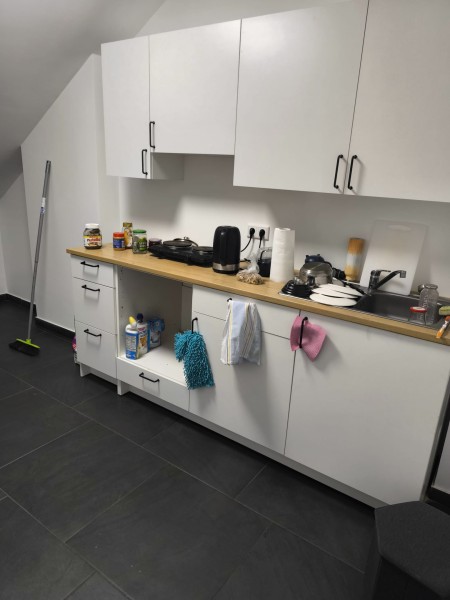 Sie ist zudem gut ausgestattet. Die Küche ist groß genug für gemeinsame Kochabende und Gäste. Zur Wohnung gehören Küchenschränke, ein Kühlschrank, drei Tische mit Stühlen, ein Couchtisch, ein Nachttisch, eine Konsole, ein Sofa, eine Matratze, ein großer Kleiderschrank, ein kleiner Kleiderschrank, ein Staubsauger und ein Fernseher. Ich kann all das für 1000€ überlassen. Zusätzlich lasse ich Teppiche, Teller, Besteck, eine Nachttischlampe und Töpfe da. Wenn Sie einziehen, ist also fast alles bereit.
