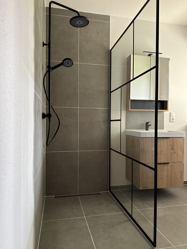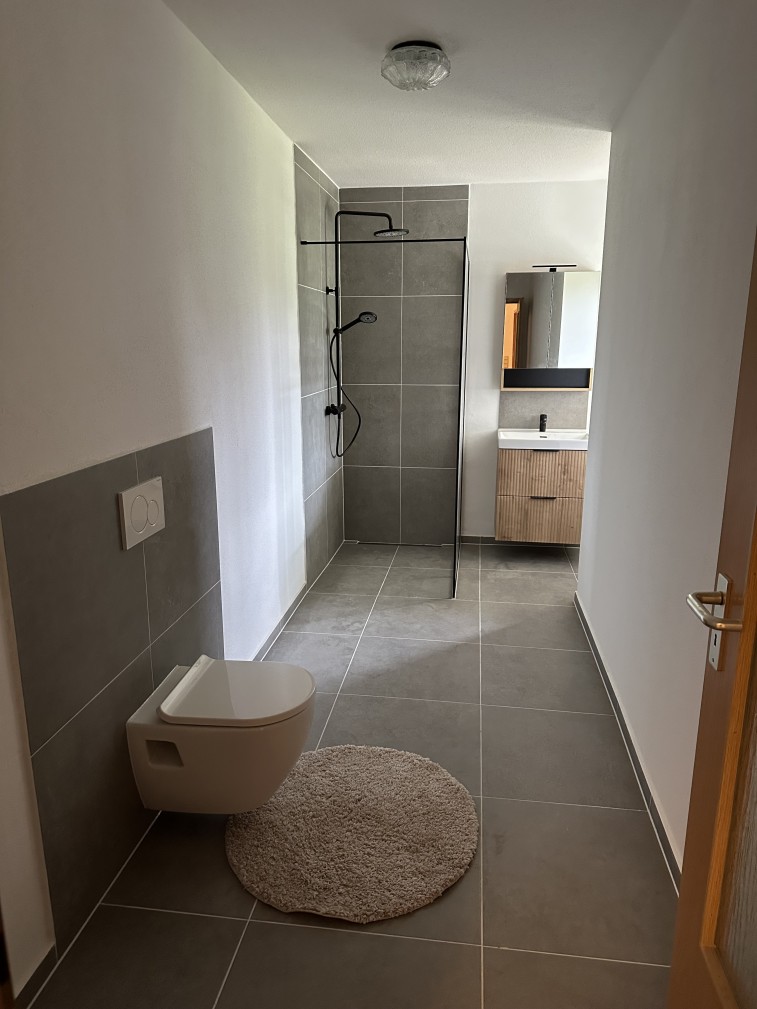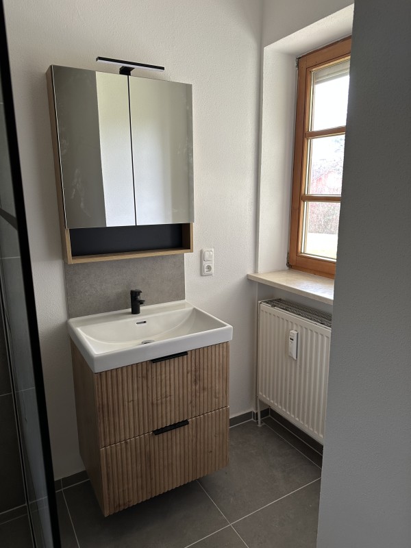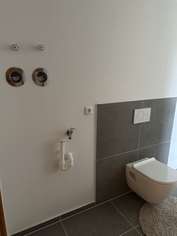 Komplett neu (Waschtisch, begehbare Dusche, Toilette, Waschmaschinen-Anschluss)