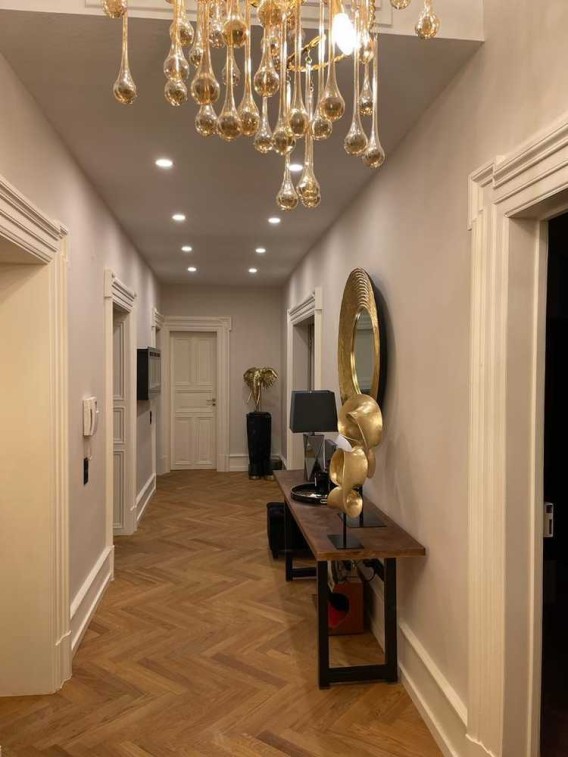 Durch einen wunderschönen Flur gelangen Sie in die repräsentativen Zimmer mit hohen stuckverzierten Decken, stilvollen Fenstern, Kassettentüren und Holzböden.