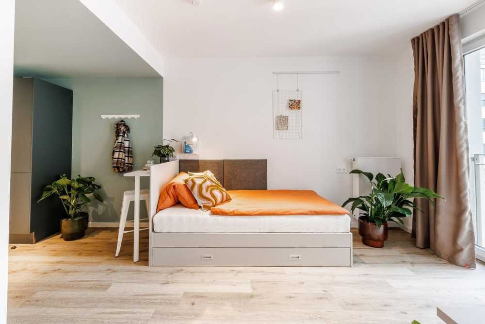 • Gemeinschaftsräume: Rezeptionslounge, Gemeinschaftsküche, Lernraum, Movie & Gaming Bereich, Dachterrasse, Fahrradkeller und Waschsalon