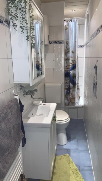 Es gibt ein eigenes WC mit Dusche und eine mitbenutzbare Einbauküche.