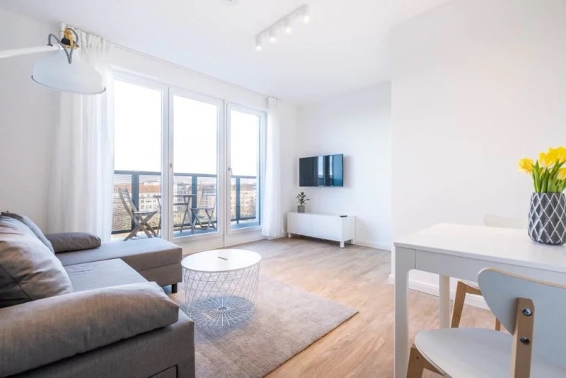 Die Einrichtung ist top-modern in weiß-grau Tönen und stilvoll eingerichtet. Es erwartet Sie ein Schlafzimmer mit großem Doppelbett und genügend Stauraum. Die Küche ist vollständig und hochwertig ausgestattet, sodass Sie sich beim kochen austoben können. Das Wohnzimmer lädt zum Entspannen ein und bietet einen extra Essbereich für gemütliches Beisammensein. Auf den Balkon können Sie das schöne Wetter genießen.
