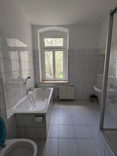 - Helles Badezimmer mit Badewanne und Duschkabine, großes Fenster und Waschmaschinenanschluss