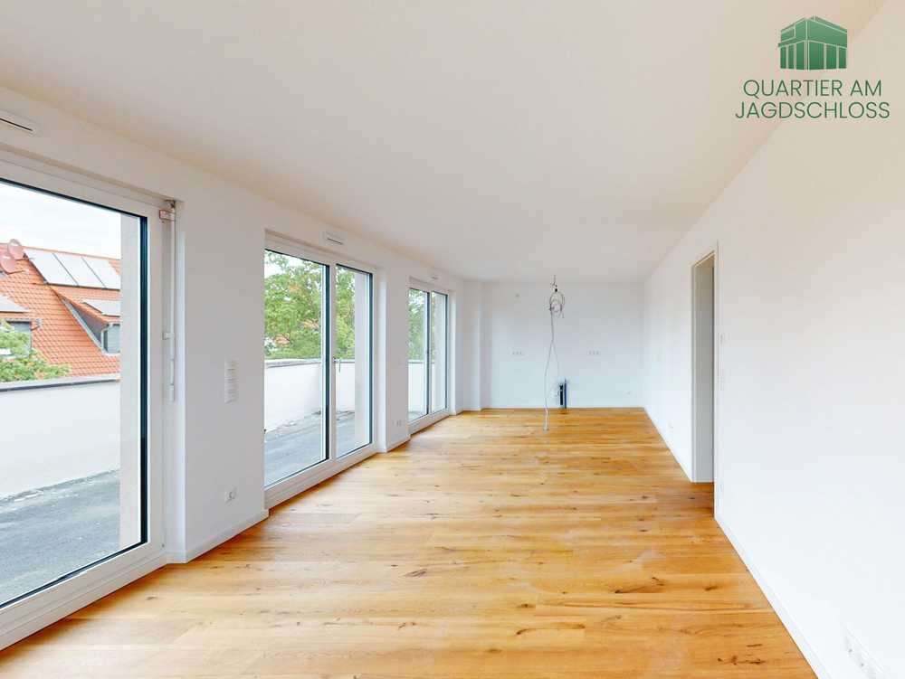Mit 94 bis 174 Quadratmetern finden Sie im Quartier am Jagdschloss eine 4-Zimmer-Wohnung, die zu Ihnen passt! Die angebotene Wohnung verfügt über drei Schlafzimmer, einen Wohn- und Essbereich mit offener Küche, ein Tageslichtbad mit Dusche und ein separates WC. Eine große Dachterrasse lädt zum Verweilen ein.