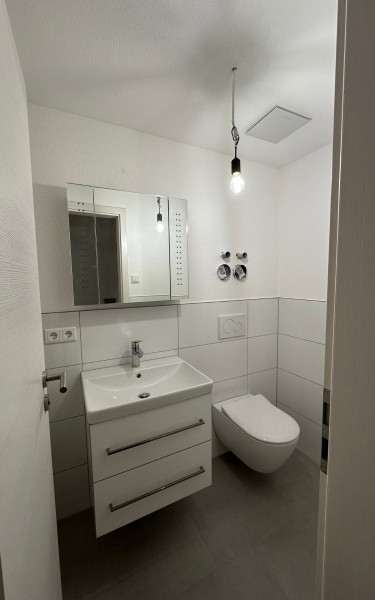 Der Eingangsbereich der Wohnung begrüßt Sie und bietet Platz für eine Garderobe und einen Schuhschrank. Das angrenzende Badezimmer ist kompakt, aber fein geschnitten, mit einem Waschbecken und einer begehbaren Dusche ausgestattet. Ein separates WC mit Armaturen von Villeroy & Boch oder Grohe bietet zusätzlichen Komfort.