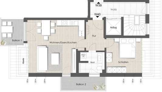 Am Ende des Flures erreichen Sie den lichtdurchfluteten offenen Wohn- und Essbereich, welcher Ihnen Zugang zum südlich als auch westlich ausgerichteten Balkon ermöglicht.