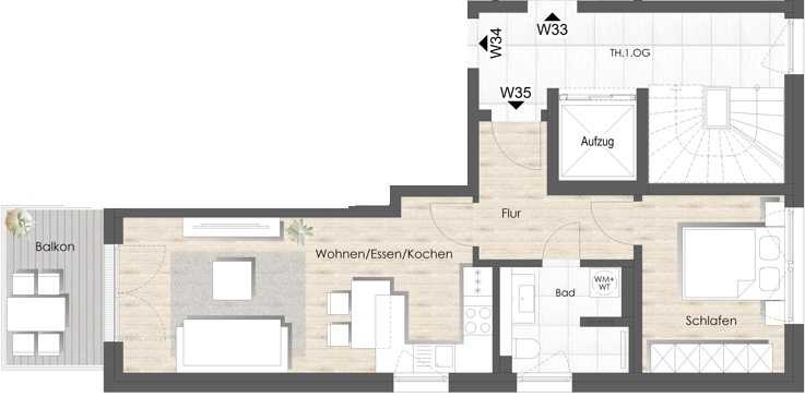 Beim Eintritt in die Wohnung, befinden Sie sich zunächst im Flur, über den Sie alle Zimmer erreichen können. Der moderne Grundriss sorgt dafür, dass sich im großzügigen Flur genügend Platz für eine Garderobe befindet. Im vorderen Teil der Wohnung erwartet Sie ein großzügiges Tageslichtbad, das mit einem Waschmaschinen- und Trockneranschluss als auch einer begehbaren Dusche ausgestattet ist und eine angenehme Atmosphäre schafft. Das geräumige Schlafzimmer bietet Ihnen genügend Platz für einen Kleiderschrank, ein Doppelbett und Nachttische, sodass Sie sich hier rundum wohlfühlen können.