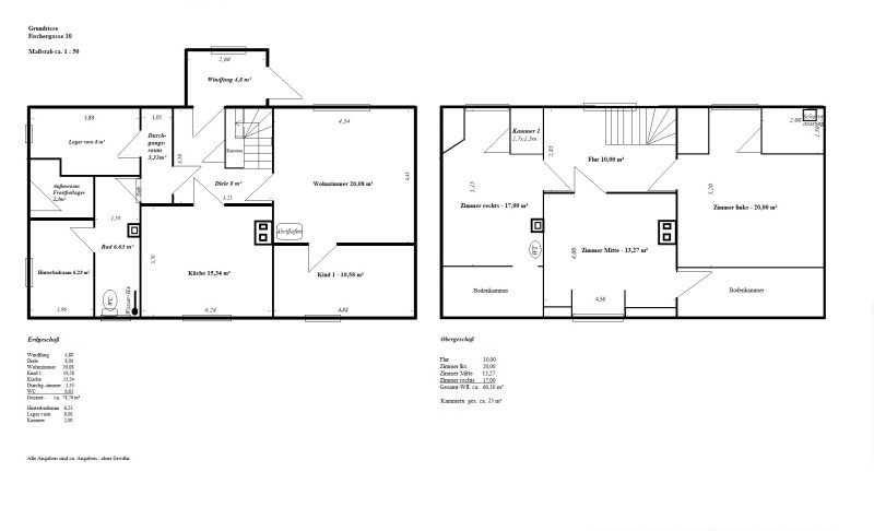 OG - ca. 60 m² - 3 Zimmer (20+17+13 m²), 10 m² Flur, Waschtisch im Kinderzimmer, 23 m² Bodenräume (2x)