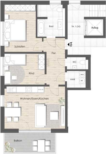 Beim Eintritt in die Wohnung, befinden Sie sich zunächst im Flur, über den Sie alle Zimmer erreichen können. Der moderne Grundriss sorgt dafür, dass sich im Flur genügend Platz für eine Garderobe befindet. Im vorderen Teil der Wohnung befindet sich das geräumige Tageslichtbad mit Badewanne und bodentiefer Dusche sowie das großzügige Schlafzimmer, welches Ihnen Platz für einen Kleiderschrank, ein Doppelbett und Nachttische bietet.