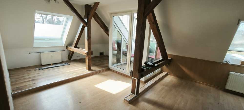 Die Wohnung verfügt über gut erhaltene Holzbalken, welche in der Wohnung verarbeitet sind. Können für allerhand genutzt werden und ideal in das Wohnen integriert bei viel kreativität. Die ausgebaute Dachboden Wohnung hat 4 Zimmer, kleine Kammern, einen kleinen Balkon und ein Badezimmer.