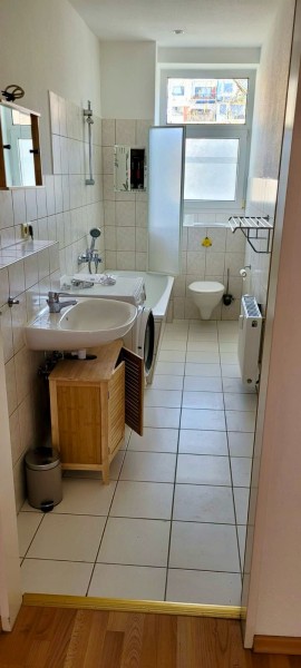 Gemeinsam mit Deinen beiden Mitbewohnern teilst Du Dir ein Tageslichtbad, das nicht nur über eine Badewanne, ein WC und ein Waschbecken verfügt, sondern auch bereits mit einigen Möbeln ausgestattet ist. Gleiches gilt für den geräumigen Flur und die Küche, in der Du eine voll ausgestattete Küche mit Ofen, Herd und Spülmaschine sowie einen Esstisch vorfindest. Unser Anspruch ist, dass Du ohne große Vorbereitung sofort einziehen und Dich wohl fühlen kannst.