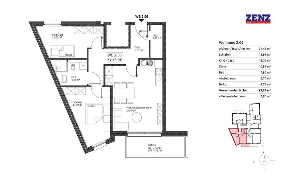 Das Schlafzimmer mit 13,99 m² bietet ausreichend Platz für ein großes Bett und Stauraum. Ein weiteres Zimmer mit 12,06 m² eignet sich ideal als Kinder- oder Gästezimmer.