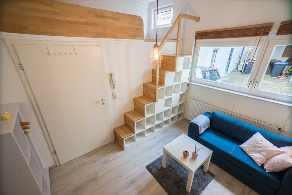 Durch das nach oben verlegte Bett, ist die Fläche sehr gut genutzt und die Wohnung auch besonders gemütlich.