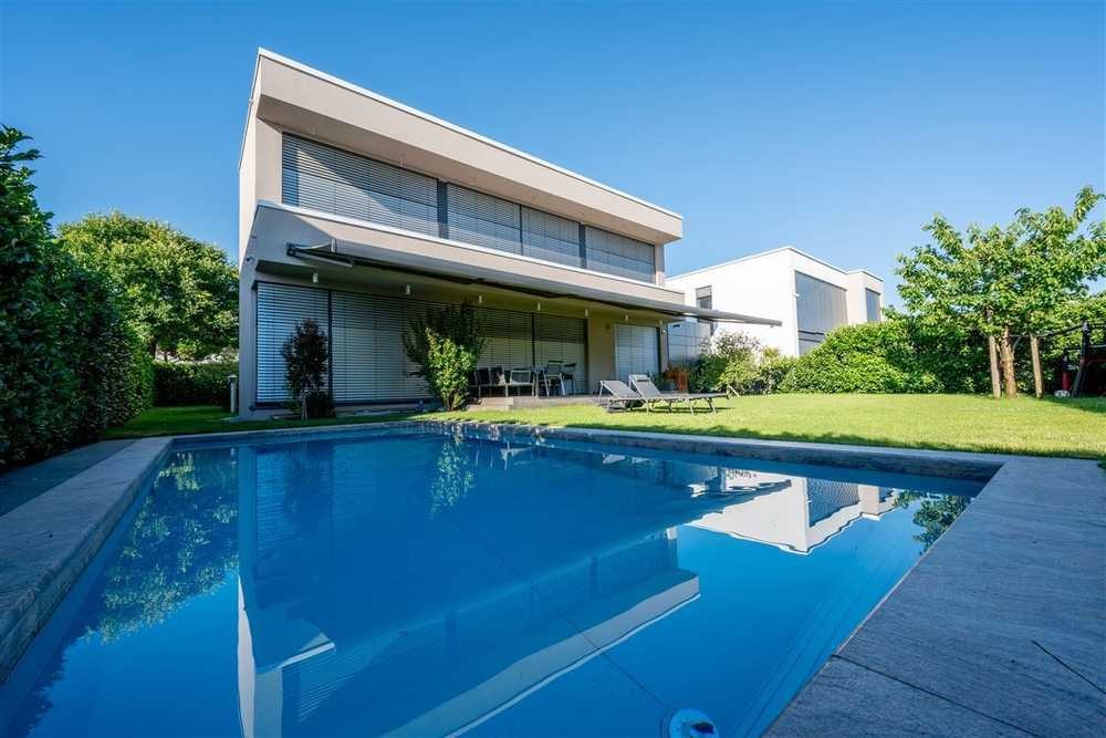 Sie betreten Ihr neues Zuhause über eine Sicherheitstüre mit Fingerprinter, je nach Ankunft über die Doppelgarage mit Lager (ca. 43 m²) oder den Zuweg auf dem Grundstück. Im Vorgarten gibt es eine kleine Terrasse im Eingangsbereich (ca. 4 m²). Über eine imposante Galerie mit über 6 m Raumhöhe und die Garderobe mit schönen Einbauschränken (Eingangsbereich insgesamt ca. 18 m²) kommen Sie entweder in das Arbeits/Gästezimmer (ca. 13 m² Wfl.) bzw. Gäste-WC (ca. 3 m²) oder in den durch bodentiefe Fenster lichtdurchfluteten und offenen Wohn-Ess- und Kochbereich (ca. 61 m²). Ein praktischer Vorratsraum (ca. 4 m²) ergänzt die maßgefertigte Schreinerküche mit hochwertigen Elektrogeräten von Bosch, Liebherr und Bora in idealer Weise. Über große Schiebeelemente geht es in Ihren Garten, zunächst zur Sonnen- und Grillterrasse mit ca. 32 m² (ca. 16 m² Wfl.) und einer 12 m elektronisch steuerbaren Markise mit schönem Tuch als Sonnenschutz. Highlight Ihrer "grünen Oase" ist der 8 x 4 m Außenpool mit Rollladen und schöner Beleuchtung.