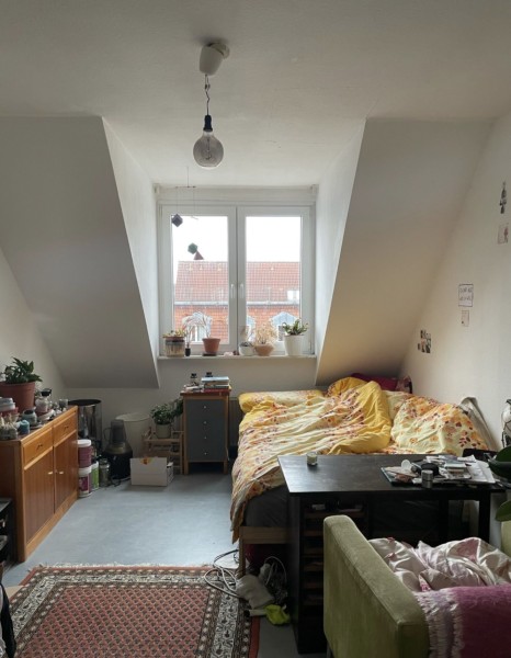 Wir leben in einer 5er WG in der 4. Etage. Unsere Wohnung geht über zwei Etagen und verfügt über eine große Wohnküche, ein kleines und ein großes Badezimmer und eine wunderschöne Dachterrasse, auf der man es sich im Sommer gut gehen lassen kann!