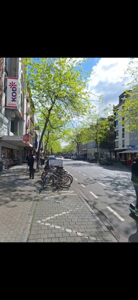 Nähe McDonalds in einer verkehrsberuhigten Seitenstraße. Und auf der Neusser Str. tobt das Leben