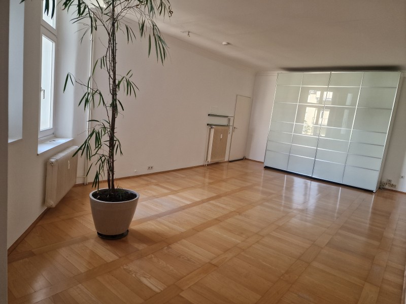 Die Wohnung befindet sich im 2.OG. Über einen kleinen Vorflur betreten Sie das großzügige Wohn-Esszimmer. Die Außenfassade hält innen was sie von außen verspricht. Sie spüren durch die hohen Decken mit Stuck und dem hochwertigen Bucheparkett den Charme des Altbaus. Von dort schweift Ihr Blick in den ruhigen begrünten Innenhof, den Sie gern zum Verweilen mitbenutzen dürfen.