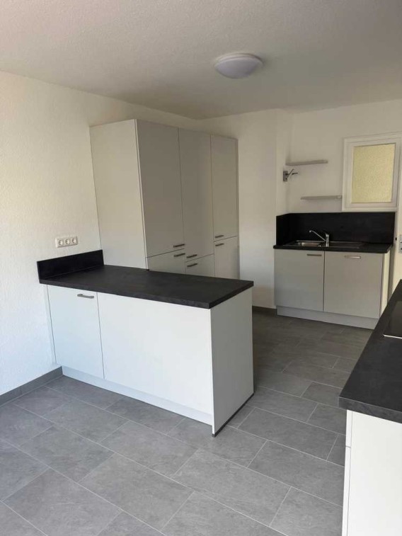 Die Küche mit der neuen Einbauküche ist sehr groß und bietet Platz für einen großen Eßtisch. Die Küche wird mitvermietet und kostet zusätzlich 60,-€ monatlich.