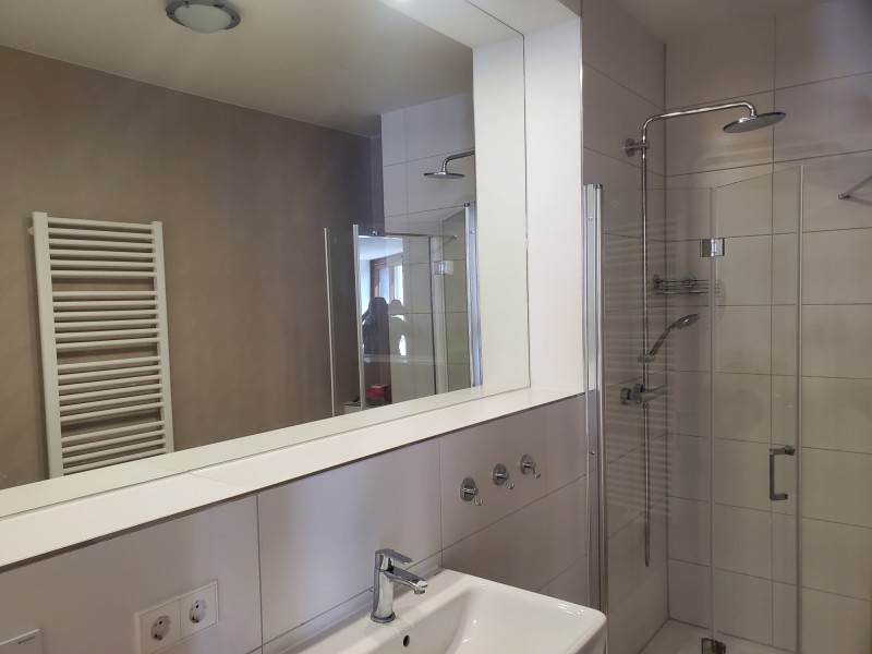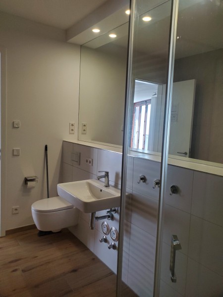 Modernes elegantes Bad, ebenerdige Dusche, hochwertige Fliesen, viel Platz, großer Spiegel