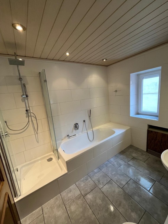 • Saniertes Badezimmer mit Badewanne und Tageslicht
