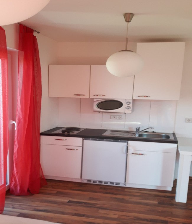 eine komplett ausgestattete Küchenzeile inkl. Mikrowelle.