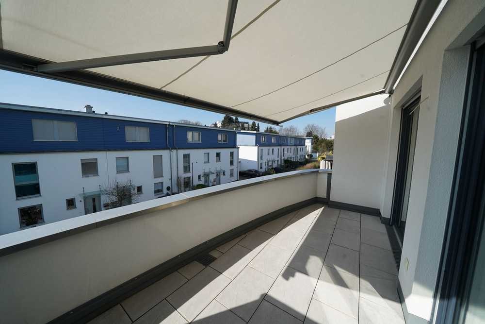Der sonnige Balkon, der zudem über eine elektrische Markise verfügt, lädt zum Verweilen und Entspannen ein. Aufgrund der wunderbaren Größe des Balkons finden hier ein großer Tisch inkl. Stühle Platz.