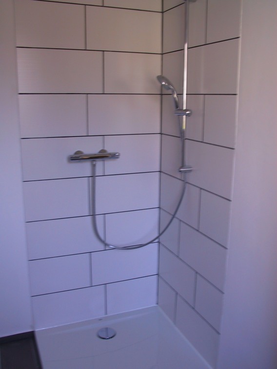 Tageslichtbad mit modernen Fliesen, bodengleicher Dusche mit Glasabtrennung pflegeleichter Steingutboden in Wohnzimmer, Küche und Schlafzimmer