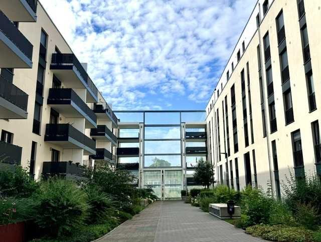 Vom Wohnbereich aus gelangen Sie auf den Balkon mit Blick über das Berliner Carrée – ein schöner Ort für die kleine Pause zwischendurch oder den Ausklang des Tages.