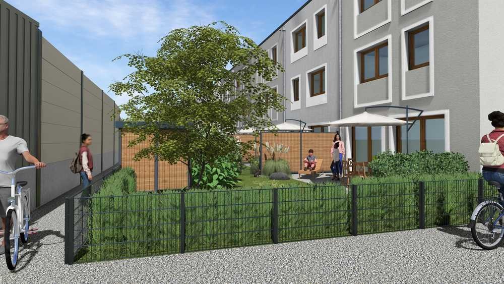 Die Stadthäuser werden über den "Elisabethgarten" erschlossen. Es gibt keinen Durchgangsverkehr - die Privatstraße ist eine Sackgasse. In den durch Hecken geschützten Vorgärten stehen Fahrradabstellplätze und ein eigener Parkplatz zur Verfügung. Eine Wallbox kann bei Bedarf nachgerüstet werden.