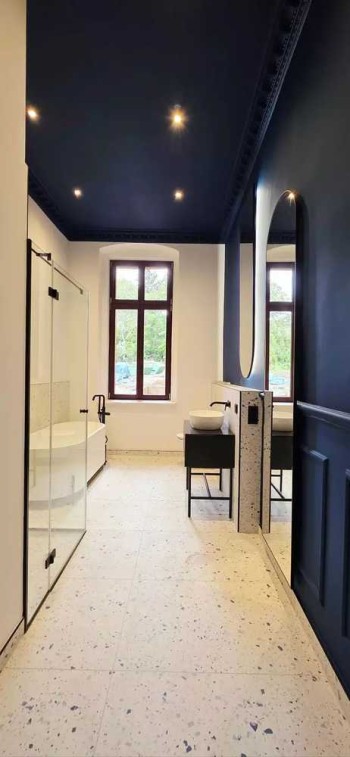 � Zwei moderne Bäder mit Terrazzofliesen, bodentiefer Dusche & freistehender Badewanne