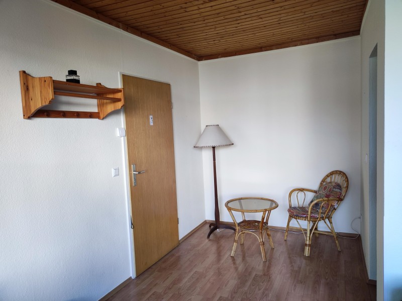Das Zimmer verfügt über ein innenliegendes Bad, eine Fußbodenheizung und ist mit Bett, Sitzecke, Schrank und Fernsehgerät ausgestattet.