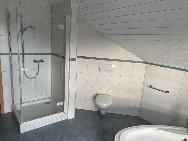 Hübsche, gemütliche DG Wohnung in ruhiger Lage und Waldrandnähe. Sehr helle Räume. Ein großes helles Zimmer, als Wohn- Esszimmer mit Küchen-nische, moderner weißer Einbauküche - anthrazitfarbener Arbeitsplatte, mit Backofen, Induktionsfeld, Dunstabzug und Geschirrspüler (alles Siemensgeräte) ohne Kühlschrank.