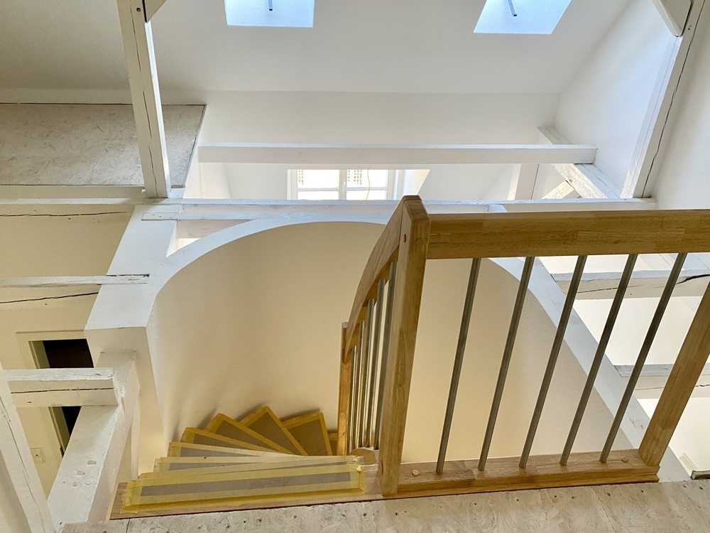 Bereits beim Betreten ist der besondere Charakter dieser Wohnung erkennbar. In das Sichtfeld gerät und unmittelbar eine geschmackvolle Wendeltreppe, die in den oberen Bereich führt, während gleichzeitig der Blick auf den offenen Wohn - Küchenbereich gelenkt wird.