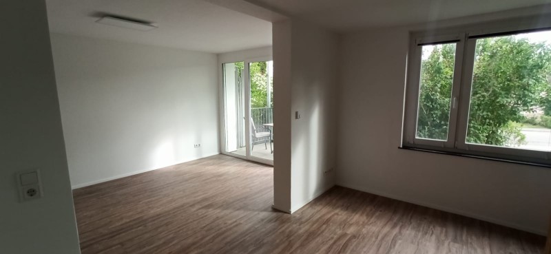 --> ein heller einladender Ess-Wohnraum mit großer Fensterfront, die geöffnet werden kann zum Balkon.