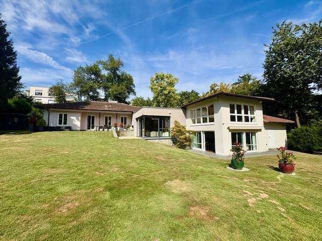 Dieses außergewöhnliche Anwesen im stilvollen Design liegt auf einem prachtvollen, parkähnlichen Grundstück mit optimaler Sonnenausrichtung. Die architektonische Raffinesse des Anwesens zeigt sich in den beiden L-förmig angeordneten Wohnflügeln, die Terrasse und Garten harmonisch umrahmen. Hier verschmelzen Haus und Natur zu einem unvergleichlichen Rückzugsort, der Ruhe und Erholung verspricht.