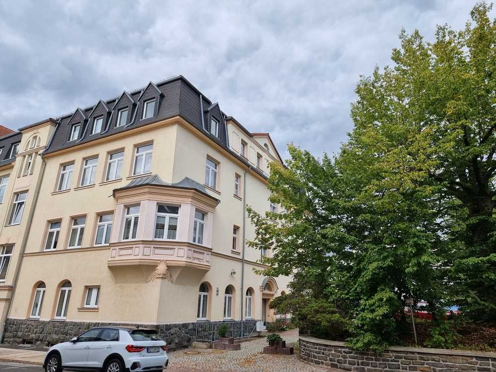 Das Gebäude strahlt durch die samtige gelbe Fassade Wärme aus. Deutlich zu sehen ist der alte Baustil in Kombination mit schlichter Neubauweise. Dies passt zur Geschichte des Gebäudes, welches Änderungen und Ergänzungen durchlebt hat, zuletzt erst im Jahr 2022/2023. Immer wieder schimmert die alte Bauweise durch, die sichtbaren Erker, bogigen Fenster, Dekorationen der Fassade, durch das, das Haus den Betrachter auf sich ziehen möchte. Ein Spitzdach mit Mansarddach vereint bildet den krönenden Abschluss dieser toll gelungenen Mischung. Straße und Privatparkplatz des Hauses ermöglichen Bewohnern und Gäste des Hauses den Parkkomfort. Gestaltete Grünflächen mit Blumen, Sträuchern, Bäumen und Sitzgelegenheiten sind Begleiter des u-förmigen Baukörpers, wenn man so will ist es wie ein kleines Märchenschloss für die Mieter, die in einem Ostflügel, Mittelbau und Westflügel untergebracht werden können. Das Gebäude verfügt über einen Fahrstuhl. Barrierearme rollstuhlgerechte Bäder sind zukunftsorientiert eingebaut. Einen frischen Anstrich haben die inneren Wände bekommen, sodass neue Lebenskraft in das Haus mit eingezogen ist. Große Fenster geben den Räumen viel Licht. Ein Keller gibt es nicht, dafür im Dachgeschoss Lagerfläche.