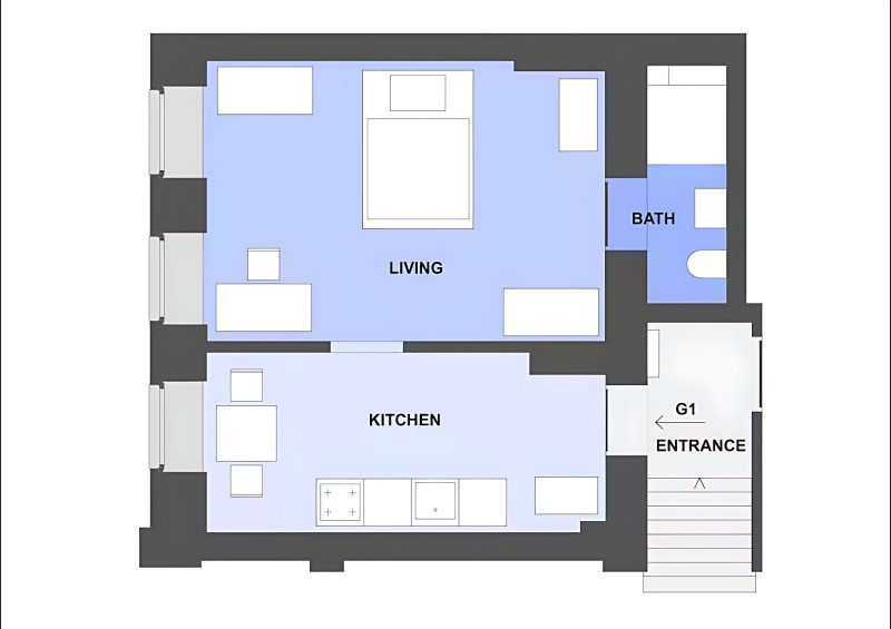 Die Whnung verfügt über 28 m², die sich auf ein großzügig geschnittenes Zimmer, eine Küche und ein Tageslichtbad mit