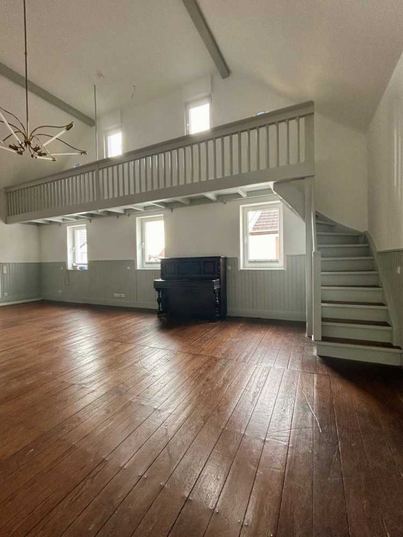 In einem liebevoll umgebauten, ehemaligen Tanzsaal mit hoher Decke und geschichtsträchtigem Flair erwartet Sie diese außergewöhnliche 3-Zimmer-Wohnung mit rund 102 m². Der großzügige Wohn-Essbereich mit integrierter Küche bietet direkten Zugang zu einem geschützten, innenliegenden Balkon – ideal für eine gemütliche Leseecke oder einen ruhigen Rückzugsort zu jeder Jahreszeit.