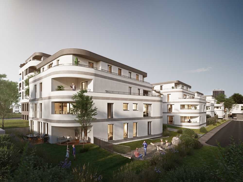 Bei den Gebäuden zur Römerstraße wurde architektonisch ansprechend eine geradlinige Klinkersteinfassade mit transparenten Balkonverkleidungen gewählt. Die Gebäude zur Walter-Flex-Str. verfügen über geschmackvolle Details wie abgerundete Ecken, bodentiefe Fenster und ein harmonisches Farbkonzept. Die Außenanlage besteht aus kleinen begrünten Innenhöfen mit Aufenthalts- und Spielflächen für ein reizvolles Wohn- und Arbeitsklima.