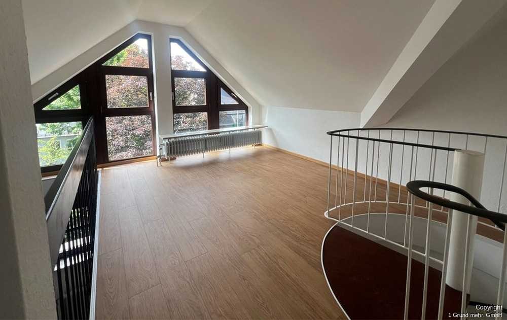 Eine Wendeltreppe führt vom Wohnzimmer auf die luftige Schlafgalerie, deren Charme vor allem durch die offene Gestaltung mit weißem Geländer zum Wohnbereich hin, die angenehme Raumhöhe und großzügige Atelierfenster unterstrichen wird.