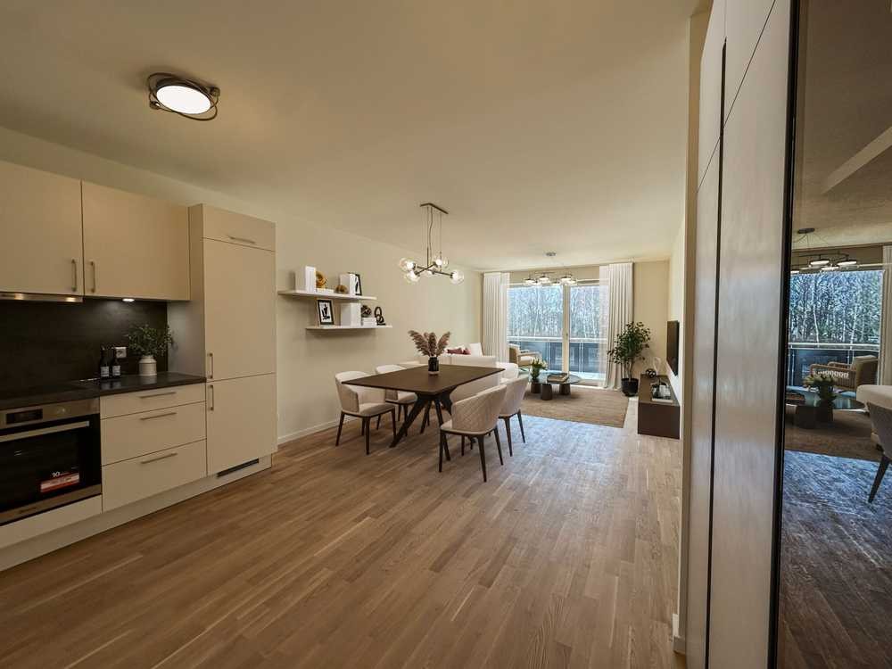 Die Wohnung ist ausgestattet mit Echtholzparkett, hochwertiger Einbauküche, großformatigen Fliesen im Badezimmer sowie einem großen Balkon.